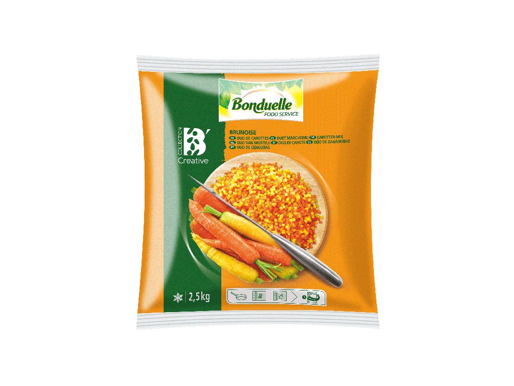 Zmrazená zeleninová směs. Mražená směs mrkve a mladé mrkve nakrájené na kostičky; z odrůdy Daucus carota. Sáček o váze 2,5 kg.