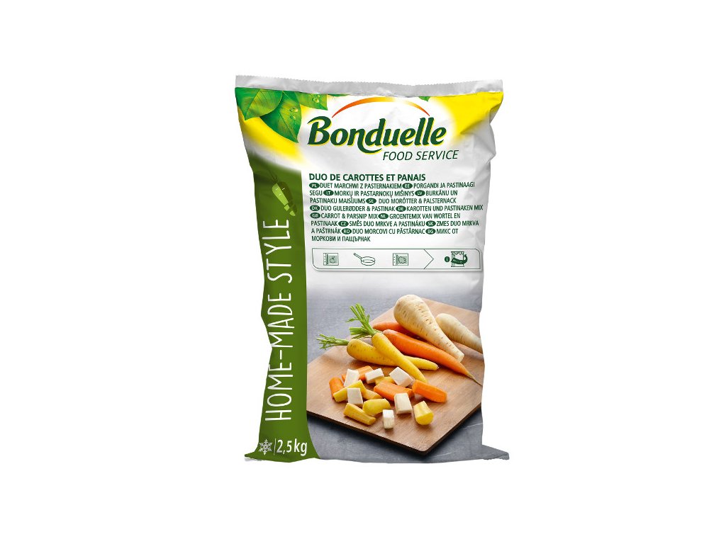 Mražená směs Duo mrkve a pastináku, která se připravuje z odrůd "Daucus Carota L." a "Pastinaca sativa L.".
