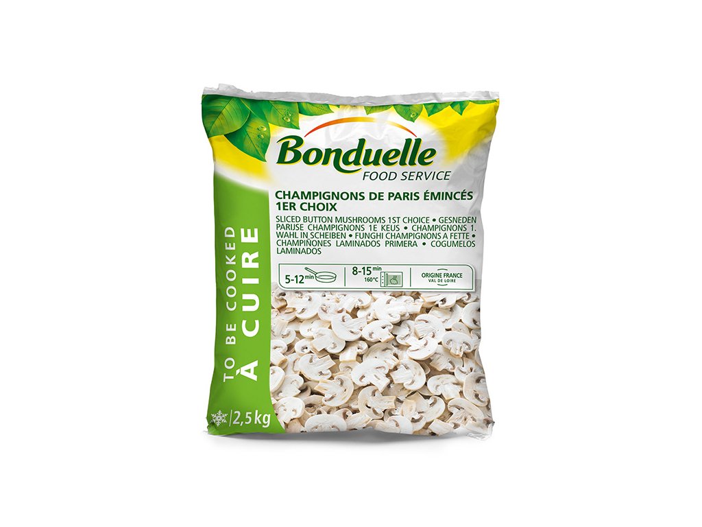 Žampiony krájené – plátky 6 mm, houby hluboce zmrazené.